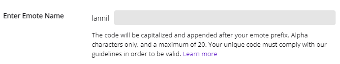 A little lower you’ll have the Enter Emote Name field, where you’ll give a name to your emote that will show after your emote prefix. For example, my prefix is lannil, so if the name of my emote is Hype, it’ll show up as lannilHype.